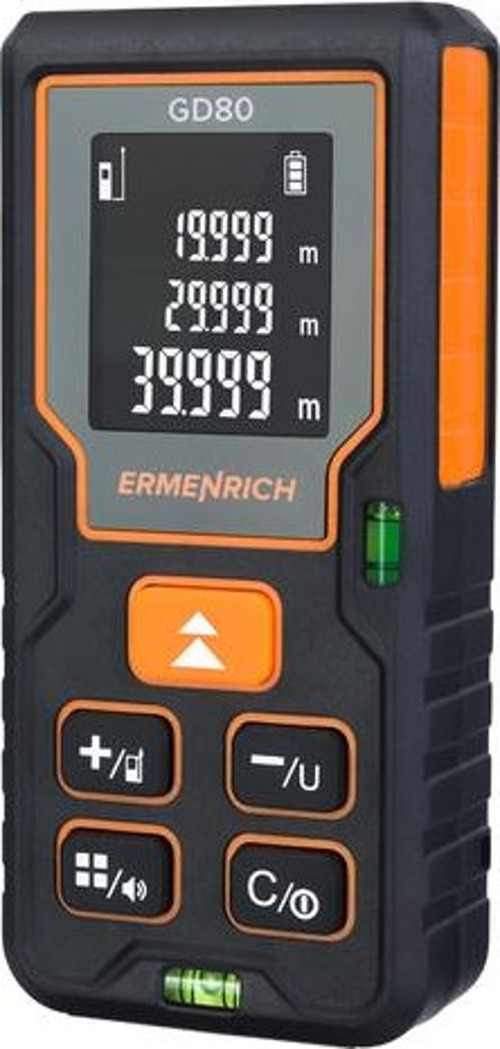 Ermenrich Reel GD80, çok çeşitli doğrusal boyut ve mesafe, alan ve hacim ölçümleri yapmak için tasarlanmış bir lazer metredir. Lazer metre, inşaat ve yenileme çalışmaları için güvenilir ve işlevsel bir araçtır, uzun iş parçalarının ve üretim süreçlerindeki ürünlerinin ölçümünü yapar ve ayrıca arazi araştırmaları yapar. Cihazın çalışma aralığı 0,05 ila 80 metredir. Yazılım, tek ve seri ölçümleri (sürekli tarama modu) mümkün kılar. Zorlu çalışma ortamlarında çalışırken, Pisagor teoremi özelliği ara ölçümler alarak iki nokta arasındaki mesafeyi hesaplar.