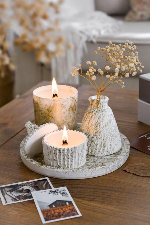 5 parça varak desenli beton vazo ve cam bardak soya wax mum seti