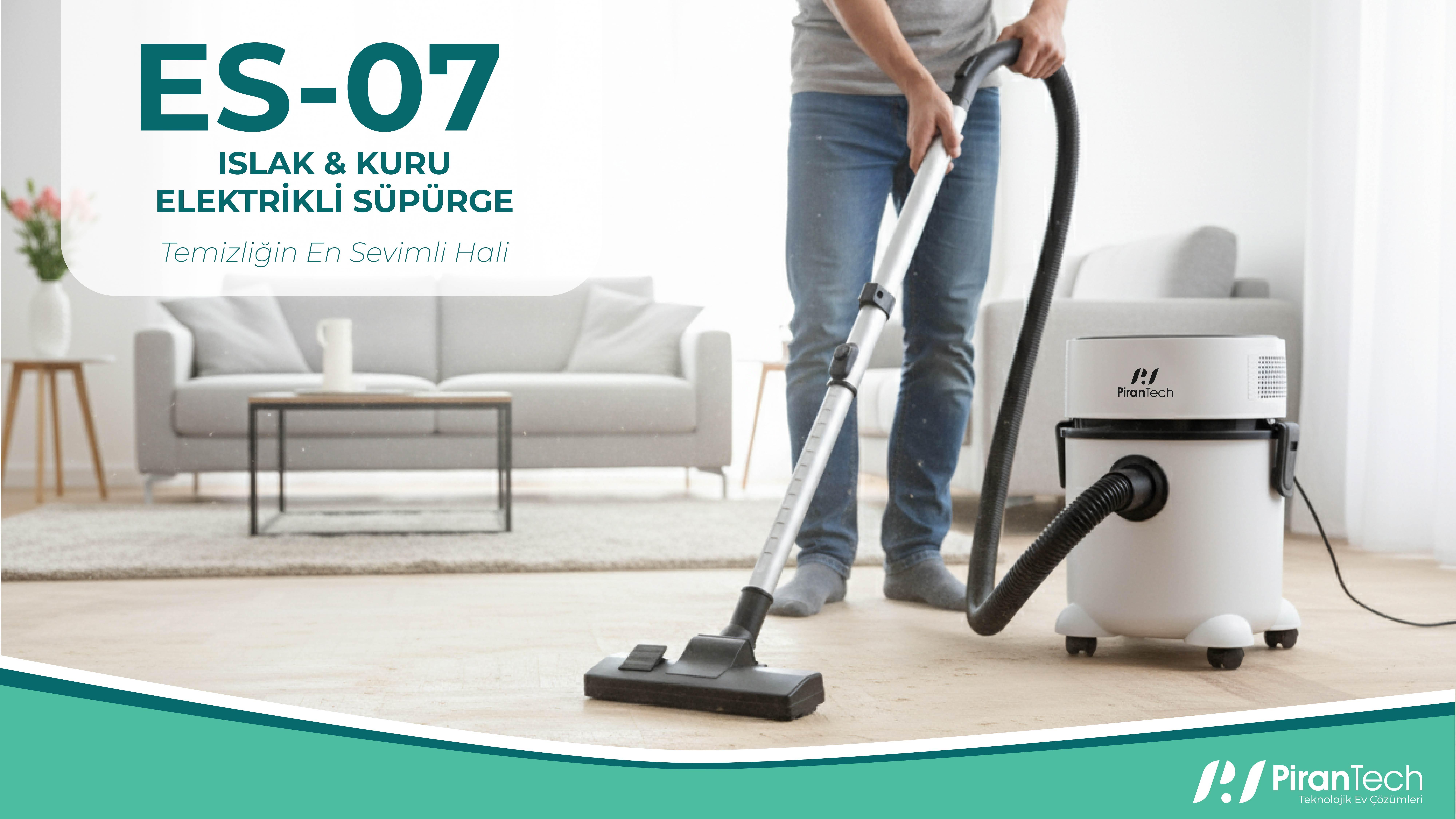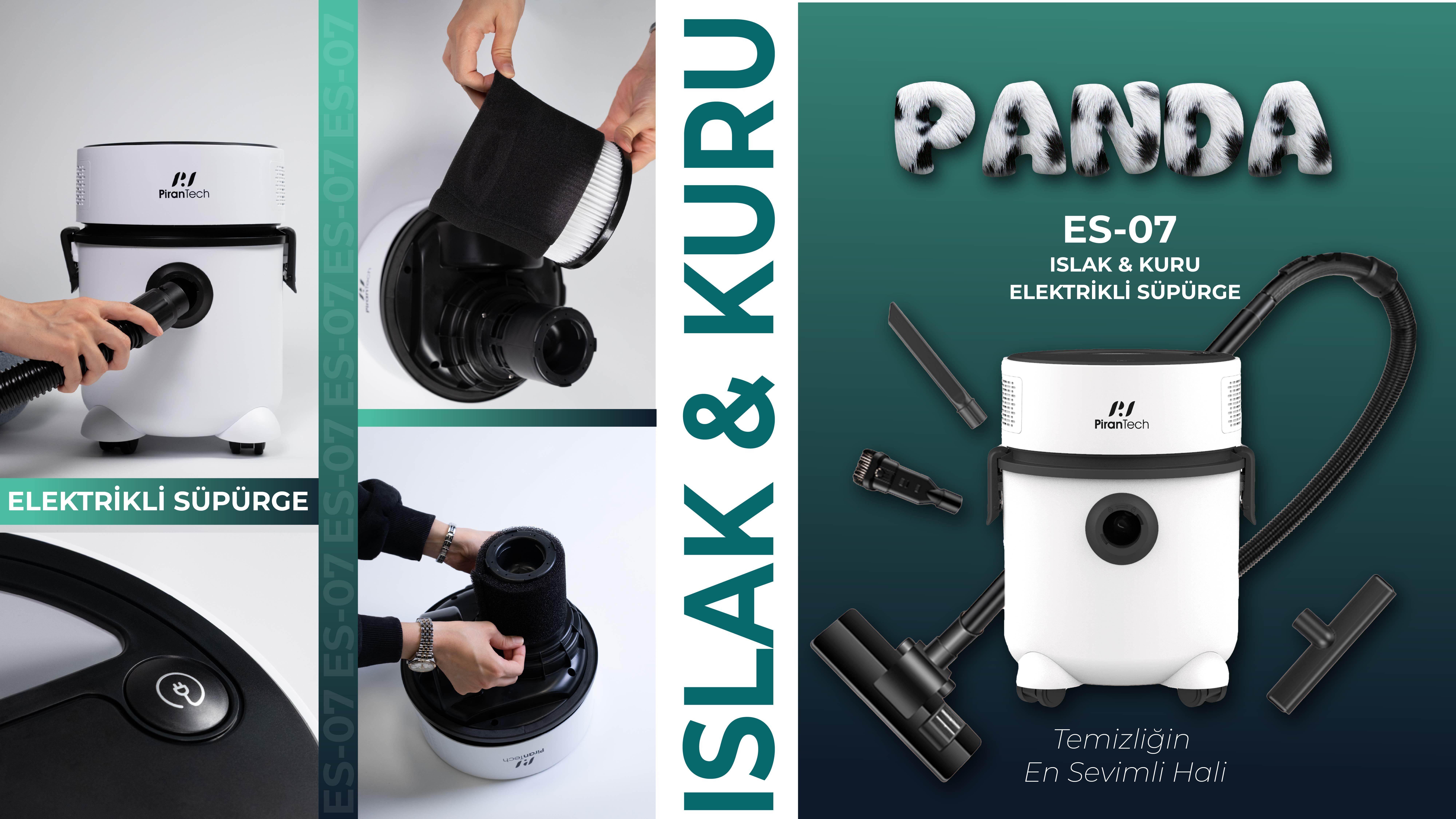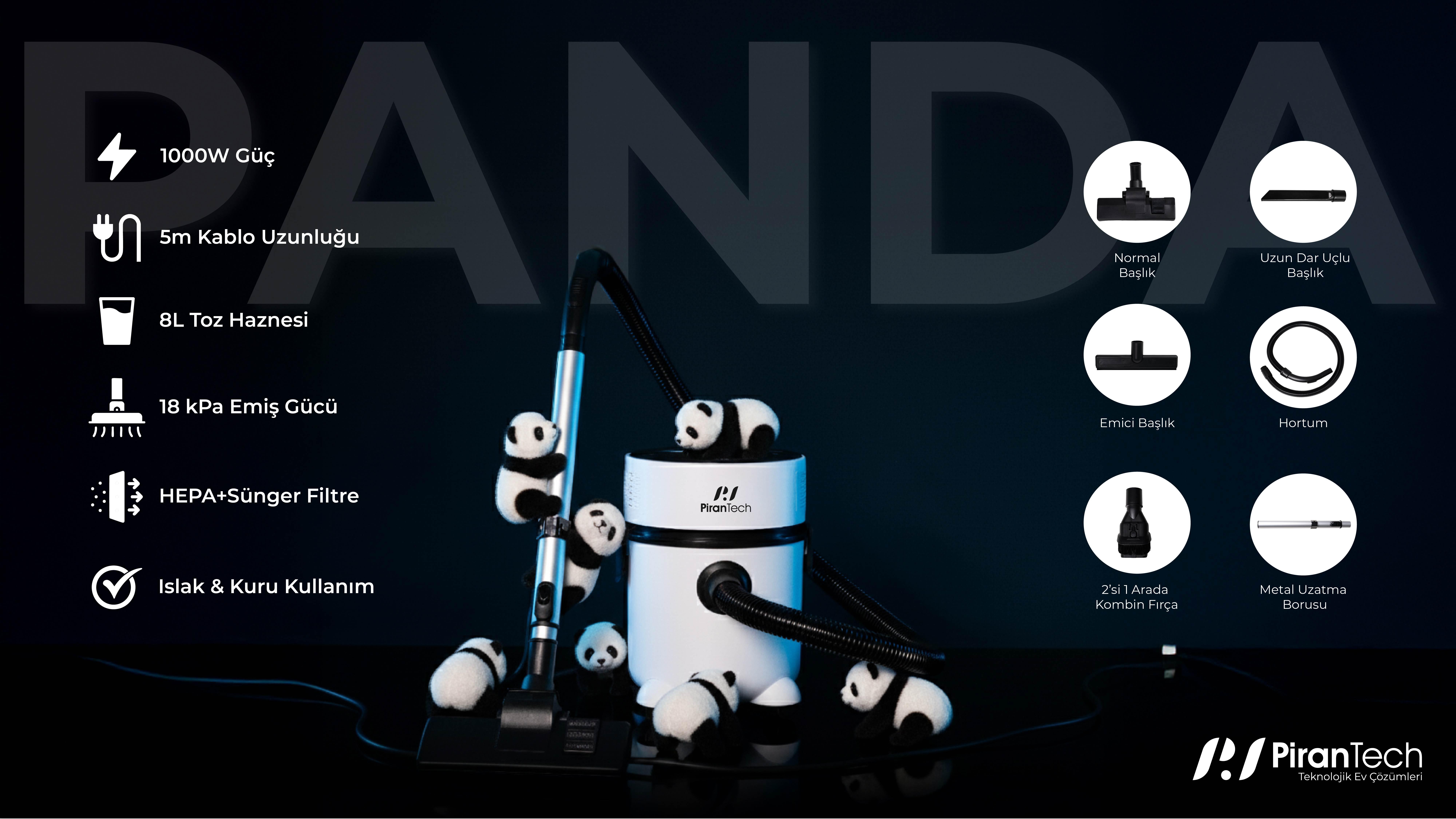 PiranTech ES-07 Panda 1000W Islak Kuru Elektrikli Süpürge | HEPA Filtreli Güçlü Motor | Kompakt Ev Tipi Süpürge