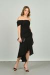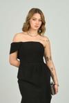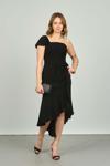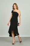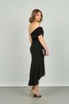 Detay: Ön ve arka kısmı balenli, tek omuz abiye elbise;