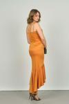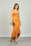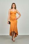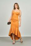 Detay: Önü balenli, ip askılı, etek kısmı fırfırlı, astarlı abiye elbise;