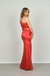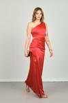 Detay: Tek omuz, derin yırtmaçlı, uzun form, bel kısmı pencere detaylı, astarlı abiye elbise;