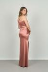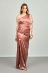 Detay: Tek omuz, derin yırtmaçlı, uzun form, bel kısmı pencere detaylı, astarlı abiye elbise;