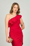 Detay: Tek omuz ve volanlı, asimetrik kesim, yırtmaçlı abiye elbise;