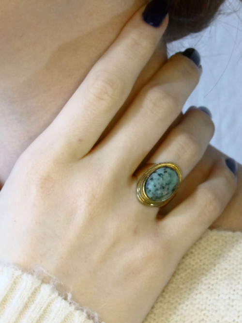 Canlı rengi sayesinde farklı zevklere hitap edebilen bu yüzük, doğal taş detayının kattığı estetik değerle uzun yıllar kullanılabilecek özel bir takı parçası olarak öne çıkar.