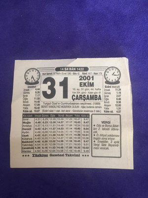 31 Ekim 2001 Takvim Yaprağı - Nostalji Koleksiyonluk Takvim Yaprağı