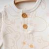 Önden düğmeli tavşan baskılı zıbını ve patikli pantolonu, bebeğinizin gün boyu rahat hareket etmesini sağlar.