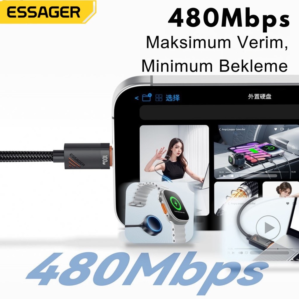 🔌 Tek Kablo, Çift Güç – Essager 100W PD 2-in-1 Kablo