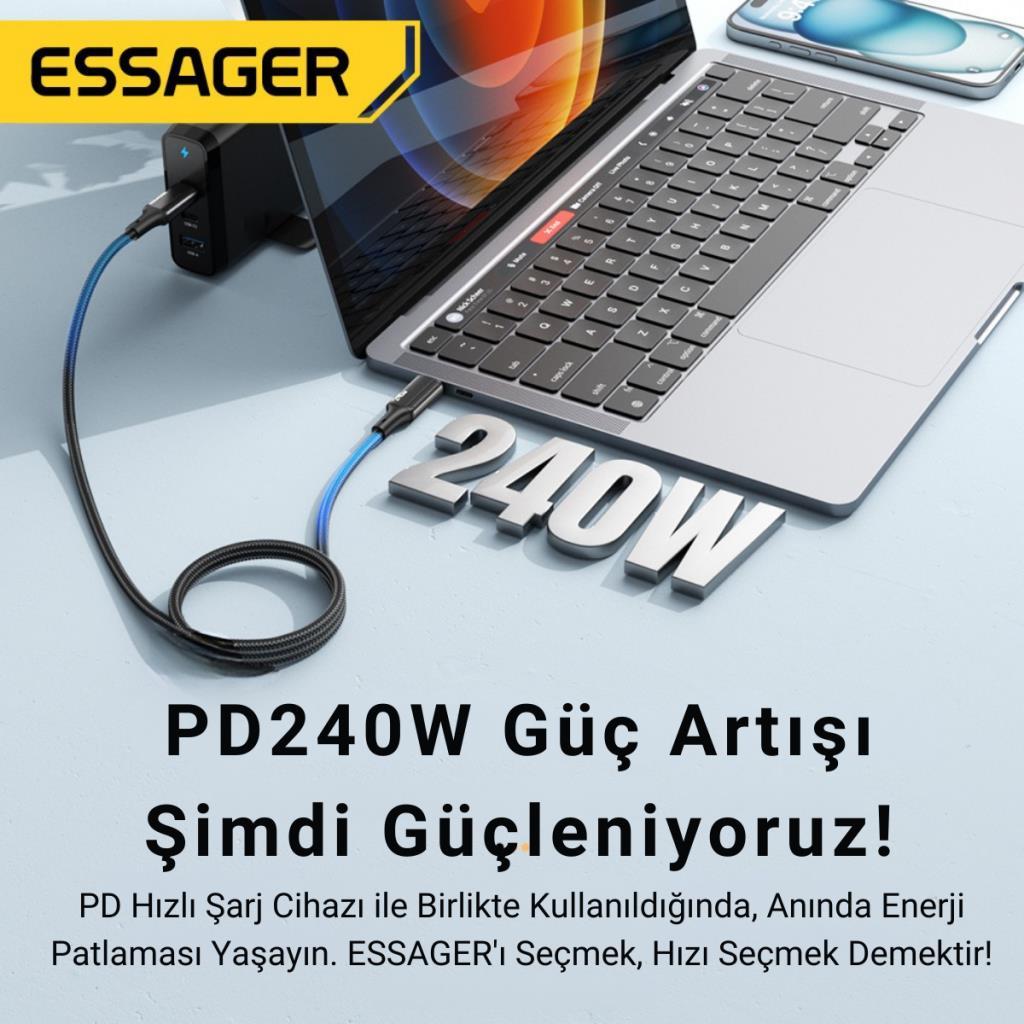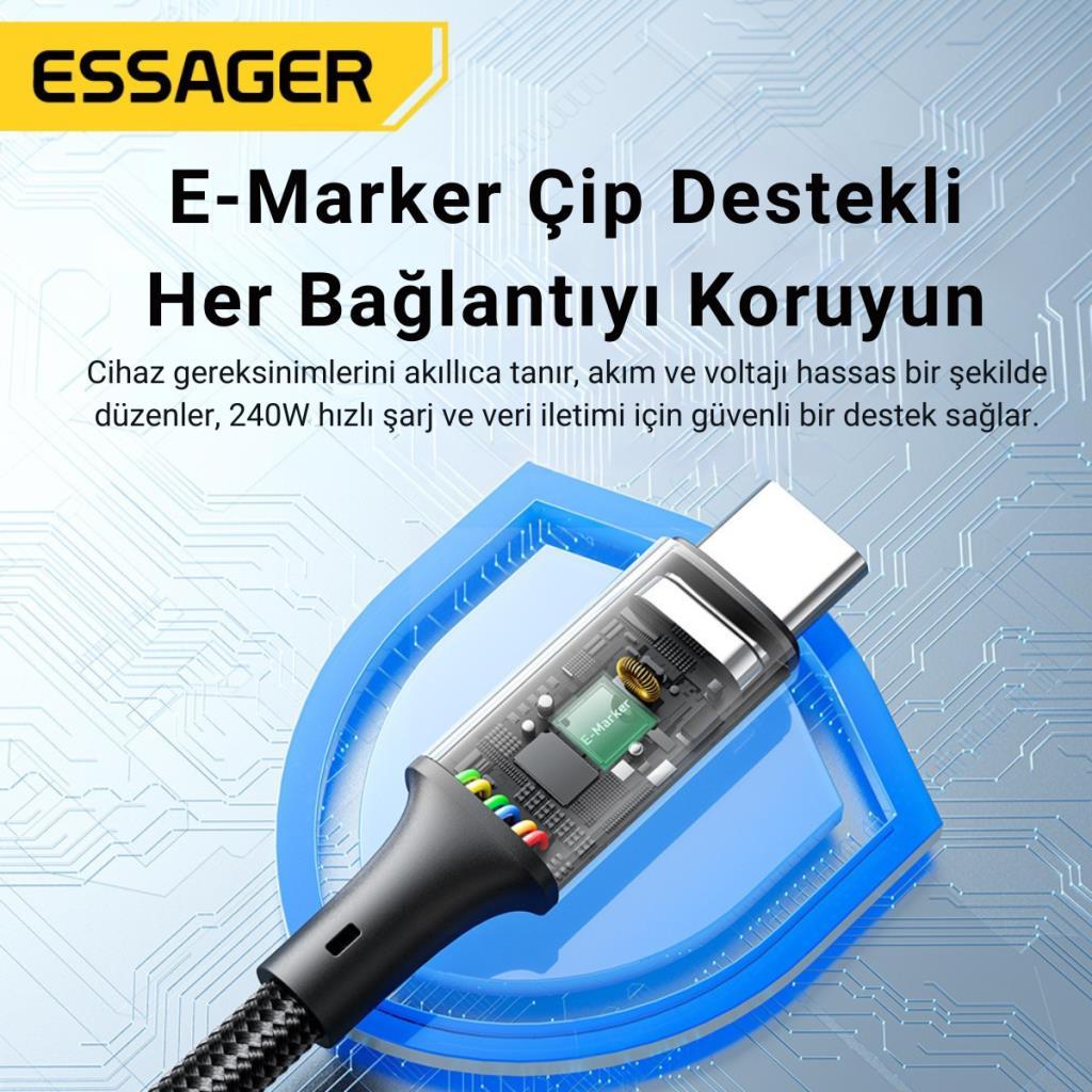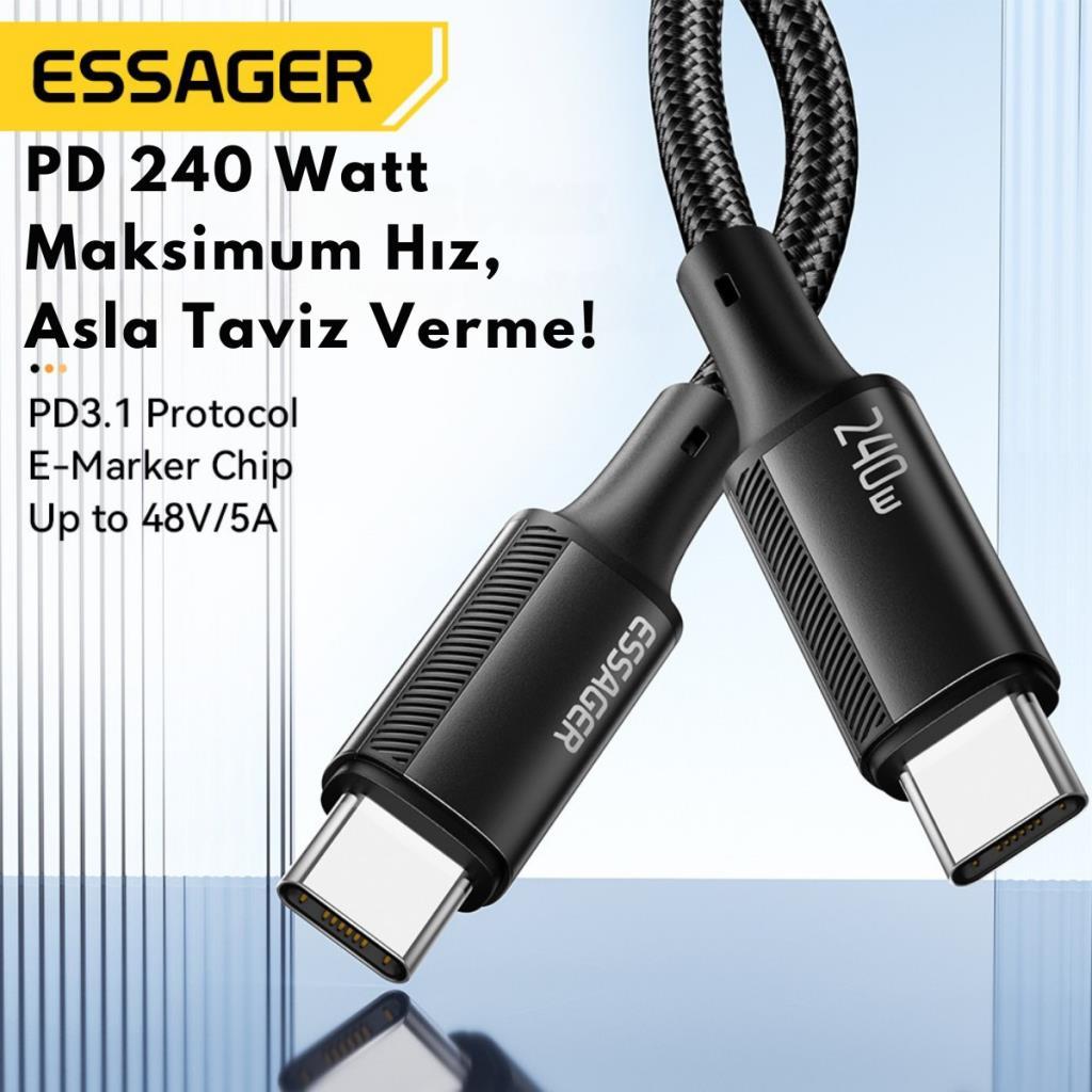 Essager E-Marker Çip 1MT PD3.1 240W Type C Şarj Kablosu 480Mbps Şarj Akım Koruma Kopmaz Kablo 48V/5A