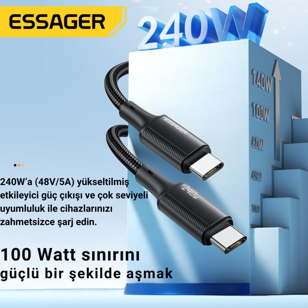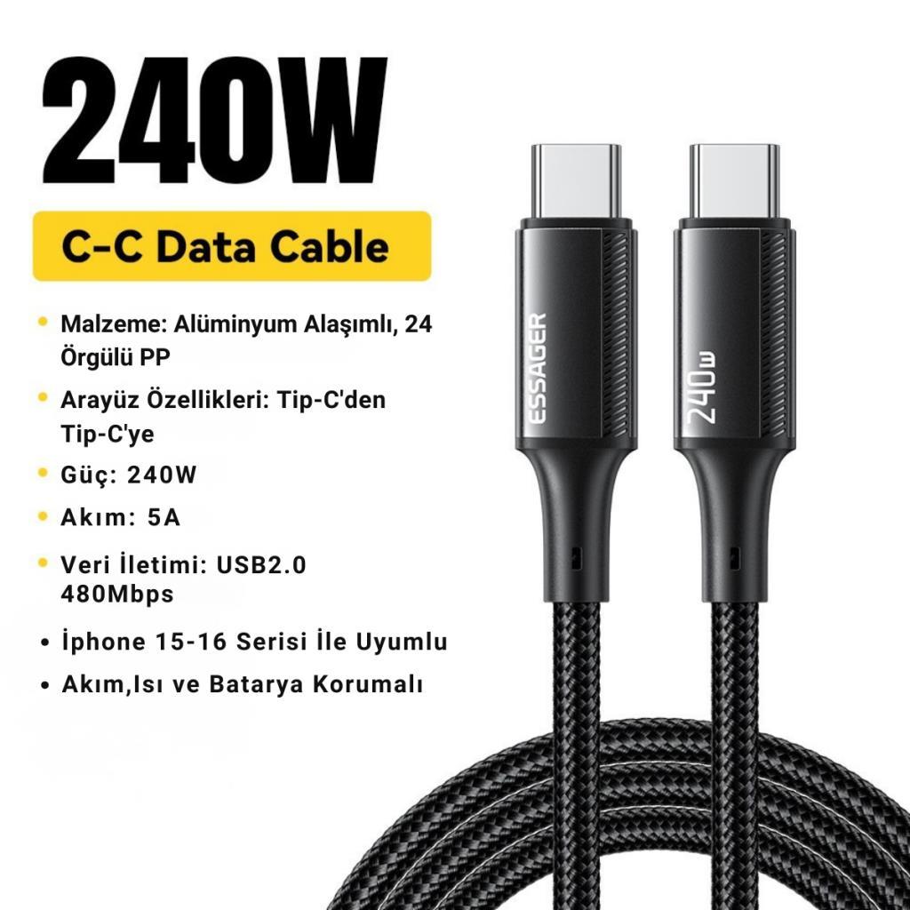 1 Adet Essager 1 Metre PD 240W Type-C to Type-C Mega Hızlı Data Şarj Kablosu