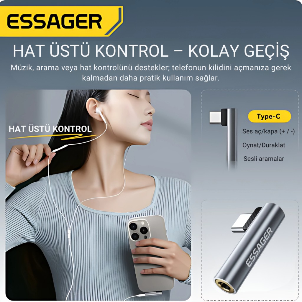 👉 Eğer Type-C girişli cihazınızda kulaklığınızı kullanmak istiyorsanız, ESSAGER L-Şekilli Ses Adaptörü tam size göre! Hem sağlam hem şık, üstelik taşınabilir yapısıyla her yerde yanınızda.