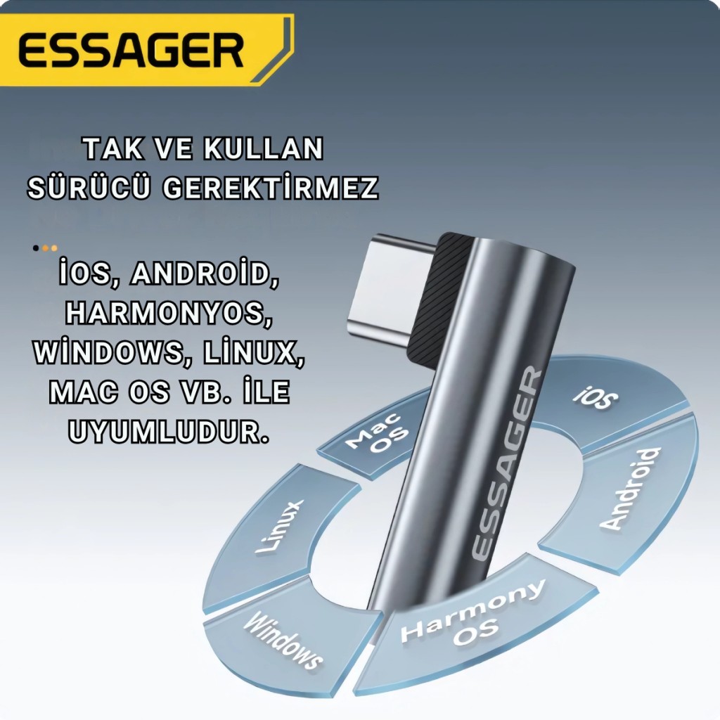 Yeni nesil telefonlarda kulaklık girişinin kaldırılmasıyla birlikte, müzik tutkunları için kaliteli ve pratik çözümler şart oldu. ESSAGER Type-C L-Şekilli Ses Adaptörü, telefonunuzu veya tabletinizi kolayca 3.5mm kulaklık jakına dönüştürerek en sevdiğiniz kulaklıkları yeniden kullanmanızı sağlar.