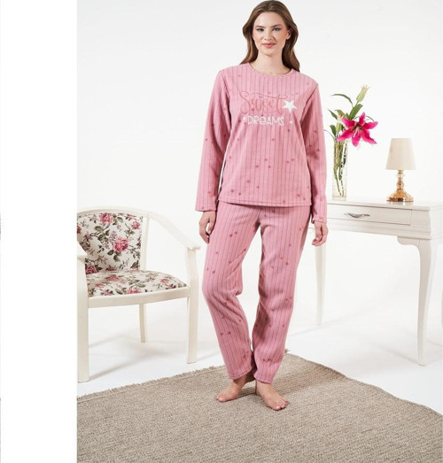 Alt üst fitilli polar puantiyeli desen bayan pijama takım,