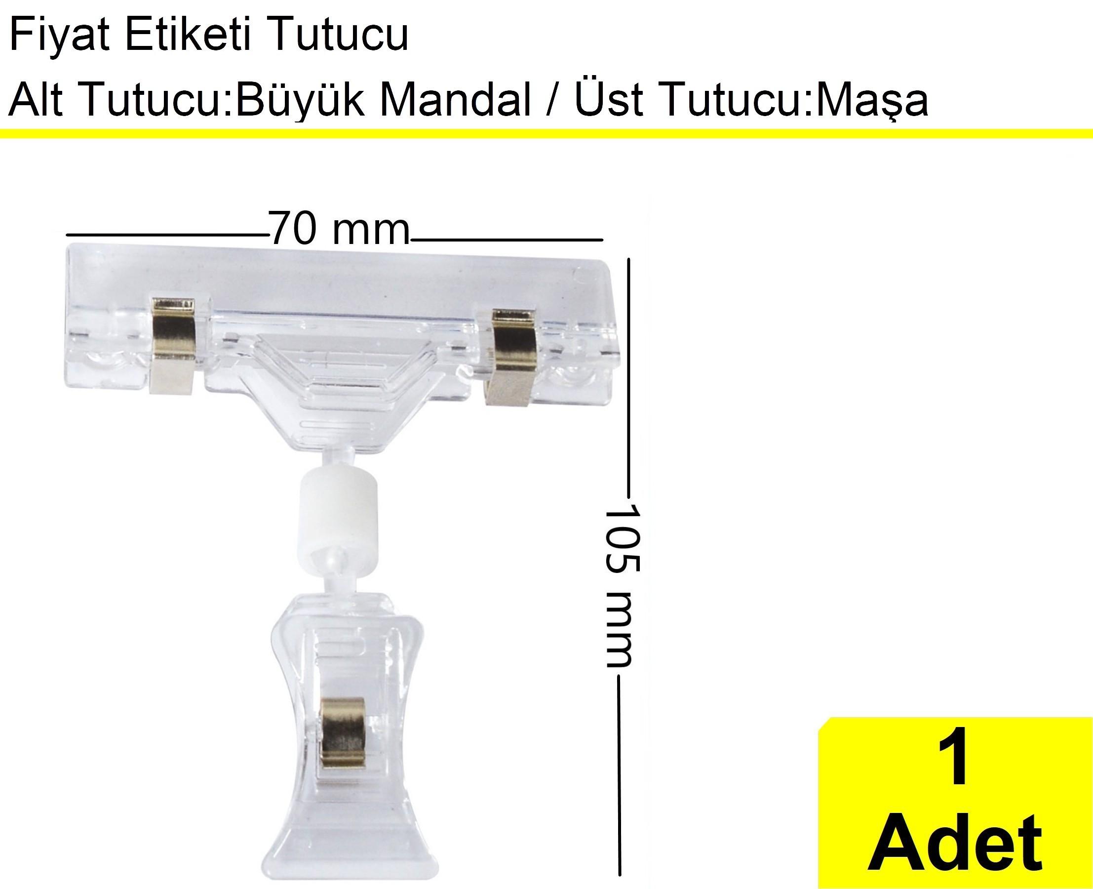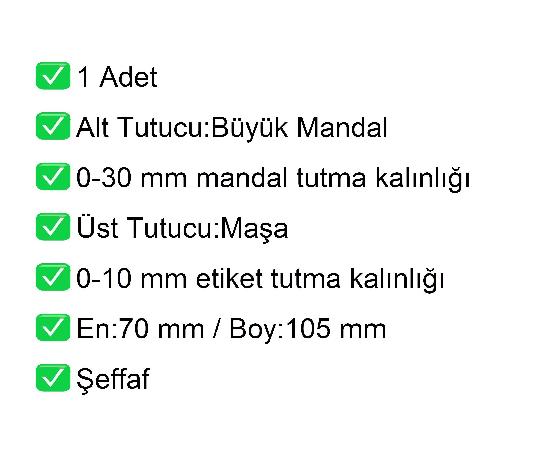 Kalınlığı 3 cm’e kadar olan her alanda tutunma sağlayan alt mandal aparatı ile fiyat etiketi, duyuru, ilan gibi bilgilerinizi sergileyebilirsiniz. Maşa etiket tutucu içerisine 10 mm’ye kadar kalınlıkta olan etiket, kâğıt, pleksi, dekota, PVC vb. gibi ürünleri sıkıştırılabilirsiniz. Bağlantı mafsalı 360° dönebilmekte olup, ürün açısını istediğiniz gibi ayarlayabilirsiniz.
