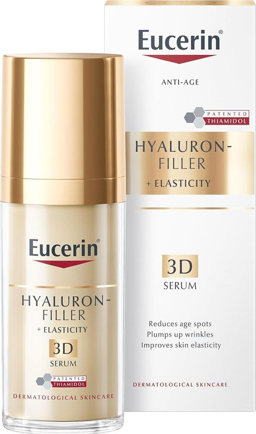 Eucerin Hyaluron-Filler + Elasticity 3D Serum, olgun ciltlerin ihtiyaçlarına yönelik üçlü etki sunar: Leke görünümünü azaltmaya, kırışıklıkları doldurmaya ve cildin elastikiyetini artırmaya yardımcı olur.