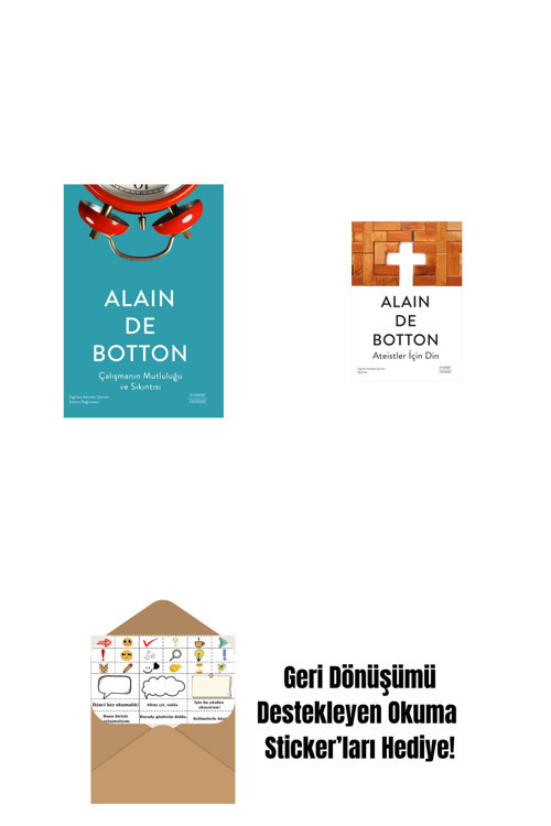 Çalışmanın Mutluluğu ve Sıkıntısı --- Çalışmanın Mutluluğu ve Sıkıntısı Alain de Botton, Çalışmanın Mutluluğu ve Sıkıntısı’nda yeni dünyanın çarklarını döndürmek için sıradan insanların gece gündüz nasıl çalıştığını, zekâ pırıltılarıyla bezeli gözlemleriyle dile döküyor: İşini tutkuyla yapanları, her gün ayakları geri geri giderek iş için yollara düşenleri ve bazı işlerin ne kadar derin bir sabır, diğerlerinin ise ne denli hız ve otomasyon gerektirdiğini ziyaret ettiği fabrikalar, limanlar, peşine takıldığı ressamlar, balıkçılar, kariyer danışmanları ve yorulmadan gezdiği fuarlar vasıtasıyla anlatıyor.; Alain de Botton çalışma hakkında akılcı ve derinlikli düşünmeye hali kalmayan çalışanların yapamadığını yaparak modern insanın “anlamlı ve keyifli bir ömür” tanımındaki olmazsa olmaz şeyi, zamanının ve enerjisinin büyük kısmını vakfettiği çalışma hayatını mercek altına alıyor.; Ünlü belgesel fotoğrafçısı Richard Baker ise, kitap için özel olarak çektiği karelerle yazara eşlik ediyor.; “Alain de Botton’un sorduğu sorular hem çok önemli hem de bir o kadar sarsıcı.; ” Financial Times “Dokunaklı portreler, ilginç detaylar ve akıl dolu yorumlarla dolu… De Botton’u okumak her zaman çok keyifli.; ” The Guardian (London) Ateistler İçin Din --- Ateistler İçin Din Bir ateist, dinlerle ilişkisini nasıl kurabilir? Kendi de bir ateist olan Alain de Botton, Ateistler İçin Din’de bu soruya, dini görünen her şeyden kaçmak yerine onlardan ilham almaya çalışmak mümkündür, diye cevap veriyor: De Botton’a göre dinler, modern hayatın düzenlenişinde bir kaynak olarak kullanılabilir; dinlerin yüzyıllardır topluluklar oluşturabilmek, birlik hissi verebilmek, bireyler arası ilişkileri düzenleyebilmek, duygusal ihtiyaçlar için kurumlar yaratabilmek gibi özellikleri, seküler yaşamda örnek alınabilir.; Ateistler İçin Din, modern hayatta dinin yerine yönelik alternatif bir bakış, ateistler için kullanışlı bir kılavuz sunuyor.