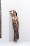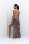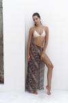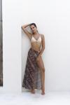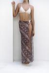 Yüksek belli, düz kesim, halka aksesuarlı, pareo etek. Desenli hafif kumaştan tasarlanmış,