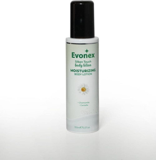 Evonex Silken Touch Moisturizing Body Lotion, papatya (Chamomile) ve kantaron (Centella) özleriyle geliştirilmiş formülü sayesinde cildine 24 saat süren yoğun nem kazandırır.