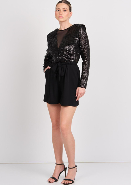 Detay: Ön ve arka kısmı derin V yaka kesimli, transparan detaylarla zenginleştirilmiş bu şort abiye tulum, üst kısmındaki payet işlemeleriyle ışıltılı bir görünüm sunar. Alt kısmı krep kumaştan tasarlanmış olan model, belden seyyar kemeriyle vücut hatlarını zarifçe vurgular. Özel davetlerde modern ve cesur bir stil arayanlar için dikkat çekici bir seçenektir;