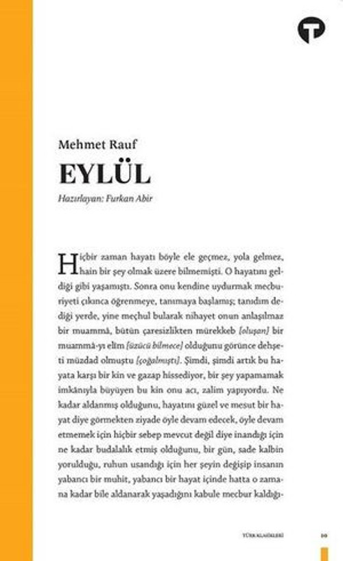 Türk edebiyatının ilk psikolojik romanı Eylül, evli bir kadın olan Suat’la Necip’in imkânsız aşkını konu edinir. Servet-i Fünun’un önde gelen yazarlarından Mehmet Rauf, mekânları ve mevsimleri de birer karaktere dönüştürüyor ve okuru sevgi sadakat, insan doğa, kadın erkek ilişkilerine dair sorular sormaya davet ediyor.