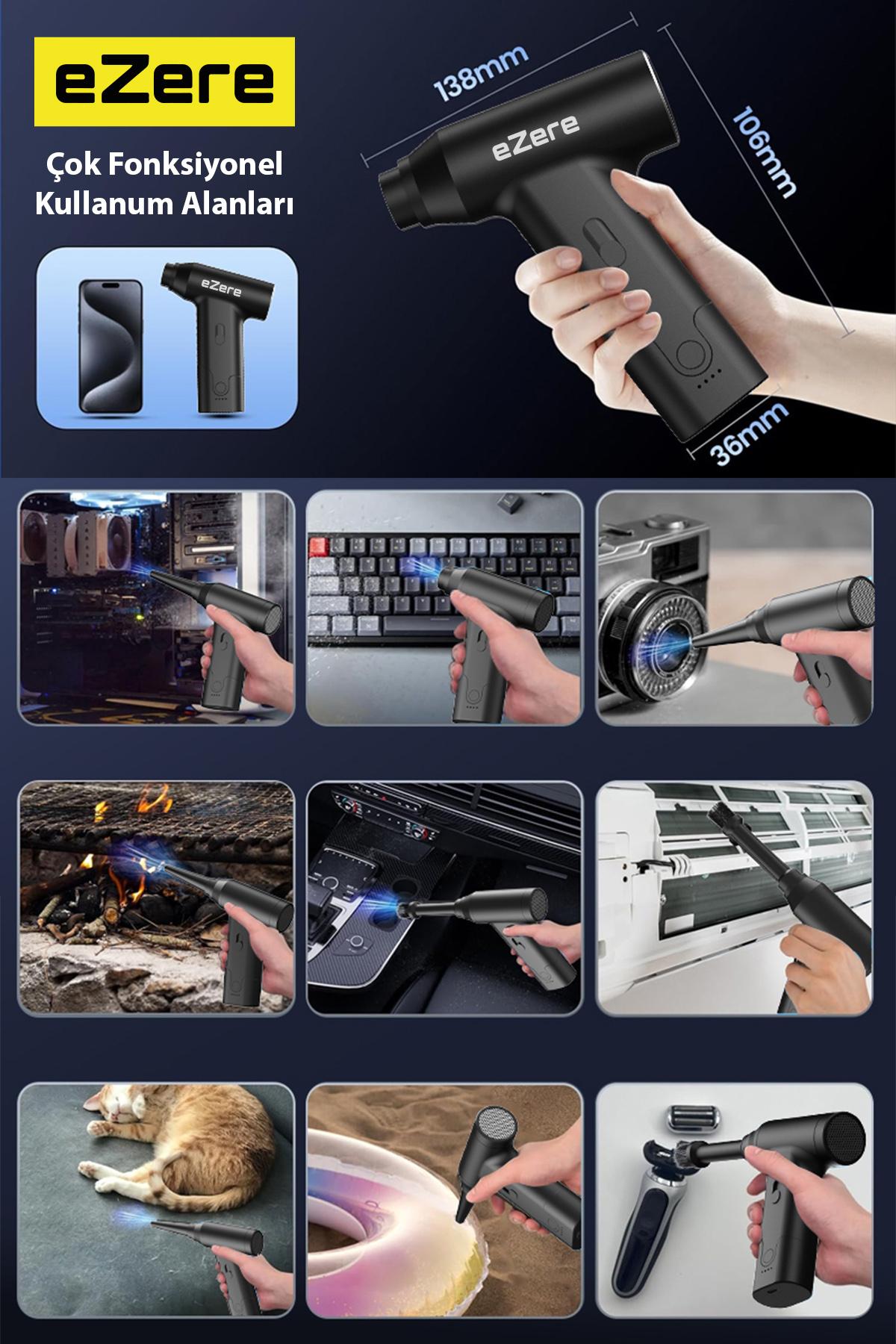 EZERE J02, 110.000 RPM yüksek devirli turbo fan motoru sayesinde hem güçlü üfleme hem de etkili vakumlama sunan çok fonksiyonlu bir mini temizlik cihazıdır. Kompakt yapısı ve hafif tasarımı ile araç içi, ev, ofis ve hassas elektronik temizliklerinde pratik kullanım sağlar.
