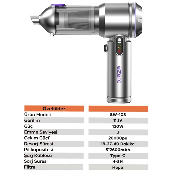 eZere 20000Pa Kablosuz El Süpürgesi & Üfleme Makinesi – 7800mAh