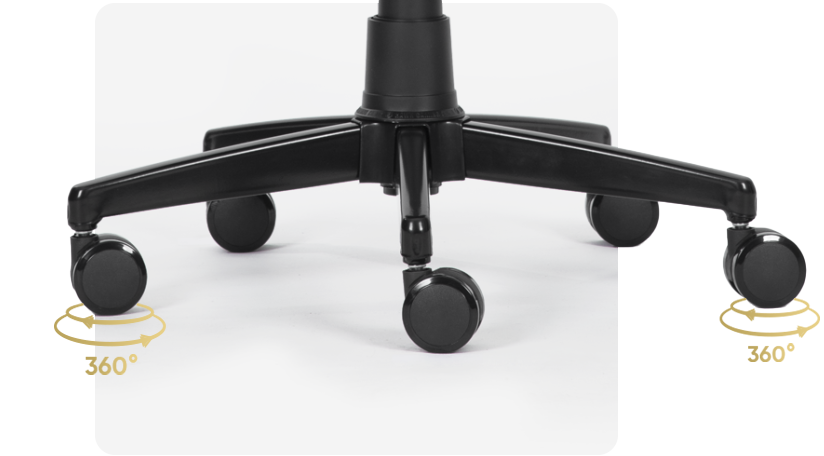 Fab kumaş oyuncu koltuğunda kullanılan Poliüretan (PU) kaplamalı tekerlekler, sert ve yumuşak zemin üzerinde sessiz ve sorunsuz çalışma hareketliliğine sahiptir.