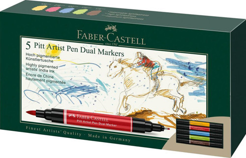 Faber Castell Pitt Artist Pen Dual Marker 5'li Set, sanatçılar, illüstratörler ve kaligrafi meraklıları için özel olarak tasarlanmıştır. Bu set, yüksek kaliteli pigmentli Hint mürekkebi içeren 5 farklı renkte çift uçlu kalemlerden oluşur. Her kalemde, yumuşak ve esnek bir fırça ucu ile detaylı çizimler için metal kaplı 0.8 mm fiber uç bulunur. Mürekkep, solmaya karşı dayanıklıdır, kuruduktan sonra suya ve lekeye karşı dirençlidir. Asit içermeyen ve pH nötr yapısı sayesinde arşivleme için uygundur. Bu özellikleriyle, eskiz, illüstrasyon, kaligrafi ve el yazısı çalışmaları için idealdir. › Yüksek pigmentli çift uçlu markör › Yumuşak ve esnek fırça uç ile sanatsal boyama ve metal fineliner uç ile kontür ve detay çizimler › Solmaya dayanıklı, kuruduğunda kalıcı mürekkep › Dağılma yapmaz › Çabuk ve kendiliğinden gelişen çizimlere uygundur Ergonomik Tasarım: Uzun süreli kullanımlarda konfor sağlar. 5 Farklı Renk: Çeşitli tonlar ile yaratıcı çalışmalar.