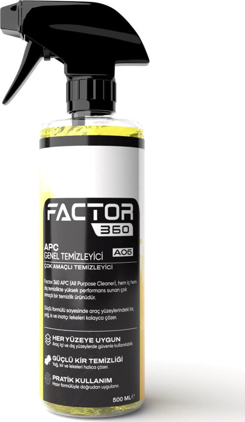 oto genel temizleyici arayan kullanıcılar için Factor360 APC Çok Amaçlı Genel Temizleyici; geniş kullanım alanı, güçlü temizlik performansı ve pratik uygulama avantajlarıyla öne çıkar. Düzenli kullanımda araç içi ve dış yüzeylerin daha temiz, bakımlı ve hijyenik kalmasına yardımcı olur.