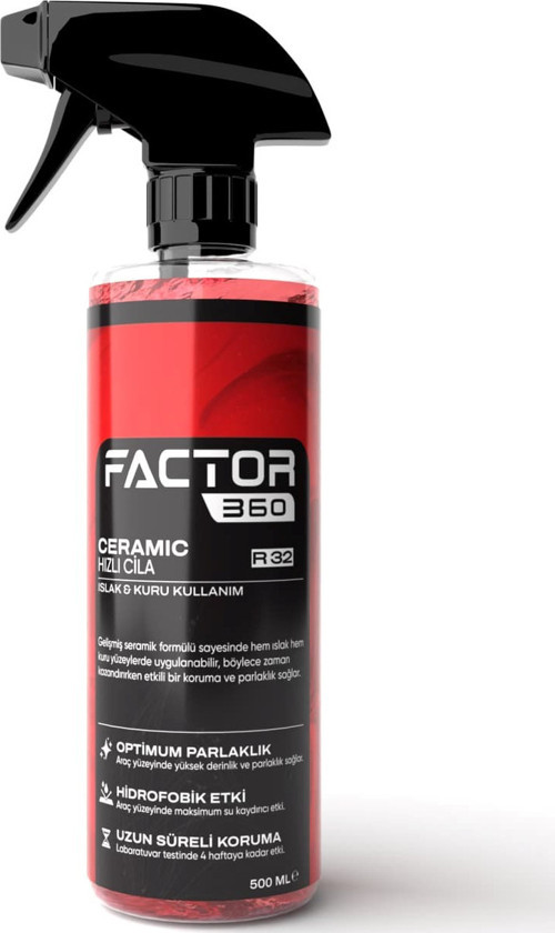 Factor360 Ceramic Hızlı Cila 500 ML, seramik bazlı içeriği sayesinde boya yüzeyinde ince bir koruyucu tabaka oluşturarak suyun ve kirin yüzeye tutunmasını zorlaştırmaya yardımcı olur. Düzenli kullanımda aracın cilalı görünümünü destekler, yüzeyin daha uzun süre temiz ve bakımlı kalmasına katkı sağlar.