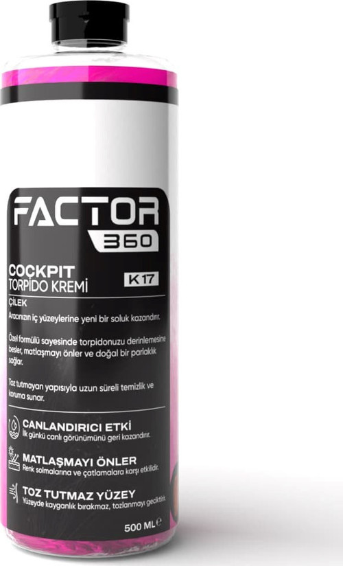 Factor360 Cockpit Torpido Kremi Çilek Kokulu 500 ML, yüzeye kontrollü şekilde yayılan yapısı sayesinde aşırı parlaklık oluşturmaz ve doğal görünümlü bir sonuç sunar. Uygulama sonrasında araç içinde hafif, tatlı ve ferah bir çilek aroması bırakarak sürüş deneyimini daha keyifli hale getirir.