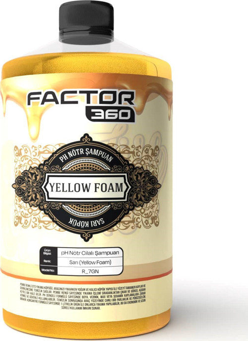Factor360 Yellow Foam Sarı Renkli Oto Yıkama Köpüğü Oto Şampuan 1 L,araç dış yüzeyinde birikenkir, toz ve yol kalıntılarınıetkili şekilde temizlemek için geliştirilmişyüksek köpük performansına sahip oto yıkama şampuanıdır.