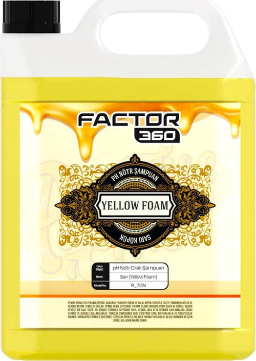 Factor360 Yellow Foam Sarı Renkli Oto Yıkama Köpüğü Oto Şampuan 1:15 Konsantre 5 L,araç dış yüzeyinde birikenkir, toz ve yol kalıntılarınıetkili şekilde temizlemek için geliştirilmişyüksek konsantrasyonlu oto yıkama şampuanıdır.