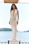 | Esnek kumaşlı,sırt ayarlamalı degaje yaka maxi elbise. |