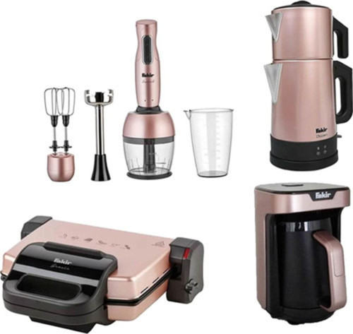 Fakir Chaizen Çay Makinesi Fakir Kaave Mono Türk Kahve Makinesi Fakir Lucca Q Blender Seti Fakir Gravis Tost Makinesi FAKİR CHAİZEN ÇAY MAKİNESİ Kaynama esnasında 1800 W güç Sıcak tutma fonksiyonu esnasında 150 W güç 1,8 litre kapasiteli su ısıtıcısı ve 1,0 litre kapasiteli demlik (çay süzgeci dahil) Otomatik kapanma ile sıcak tutma özelliği Aşırı ısınma koruması Kaynamayı gösteren kırmızı, sıcak tutma fonksiyonunu gösteren yeşil renkli gösterge ışıkları Paslanmaz çelik çay süzgeci ile uzun ömürlü kullanım Açma/kapama tuşu360°dönebilen kablosuz su ısıtıcısı Kablo sarma yuvası FAKİR KAAVE MONO KAHVE MAKİNESİ Güç: 535 W Gerilim: 220-240 V AC, 50/60 Hz Kapasite: Max 4 Türk kahvesi fincanı (70 ml orta boy) Tek tuşla kolay kontrol Işıklı uyarı Sesli uyarı Su olmadan çalışmasını engelleyen koruma Taşmayı önleyen Luminasense Technology Çalışma esnasında kademeli aydınlatma sistemi Su seviye penceresi Kablo boyu: 80 cm Kahve ölçü kaşığı FAKİR LUCCA Q BLENDER SETİ Güç (Watt): 1000 Hız Kademesi: 2 Turbo Fonksiyonu Güvenli Kullanım Tuşu: Yok Kaymaz Taban Paslanmaz Çelik Mikser Aparatı Paslanmaz Çelik Çırpıcı Aparatı: Yok Doğrayıcı Haznesi: 500ml kapasiteli Ölçü Kabı: 900ml kapasiteli Dış Gövde: Plastik FAKİR GRAVİS TOST MAKİNESİ 1800 Watt 4 kademeli ısı ayarı Yapışmaz kaplama plakalar Hızlı pişirme için yüksek performans Ayarlanabilir ısı kontrol düğmesi Geniş Izgara yüzeyi Aşırı Isınma güvenlik koruması