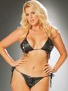 Fantazi büyük beden deri metalli sütyen ve kilot takımı, cesur ve etkileyici bir iç giyim seçeneğidir.