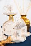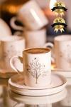 Bu lüks kahve fincan takımı, 6 kişilik geniş kapasitesiyle, 6 adet kahve fincanı ve 6 adet eşleşen tabaktan oluşur. Her bir fincan ve tabak, zarif Hayat Ağacı motifleriyle süslenmiş ve altın yaldız detaylarıyla zenginleştirilmiş kırık beyaz porselenden yapılmıştır.