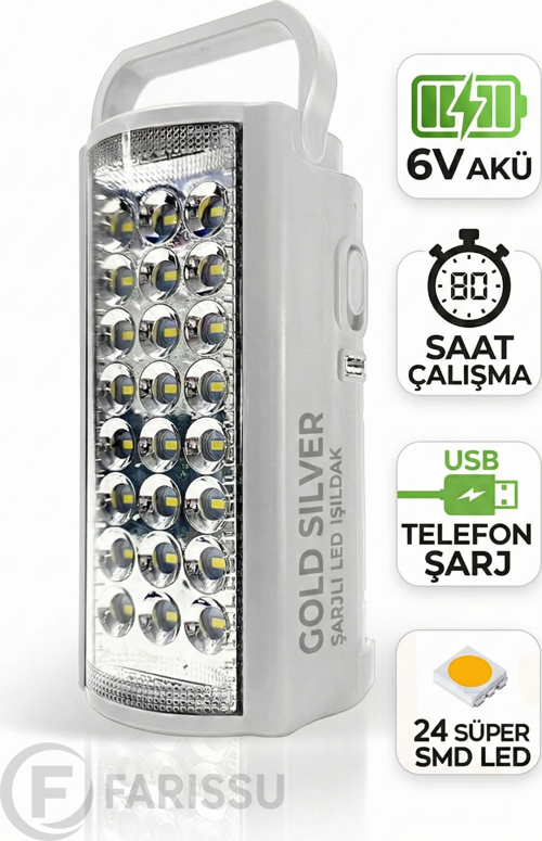 Farissu Gold Silver GS-2400 Şarjlı 24 LED Işıldak & Powerbank - 80 Saat Aydınlatma (Telefon Şarj Eder)