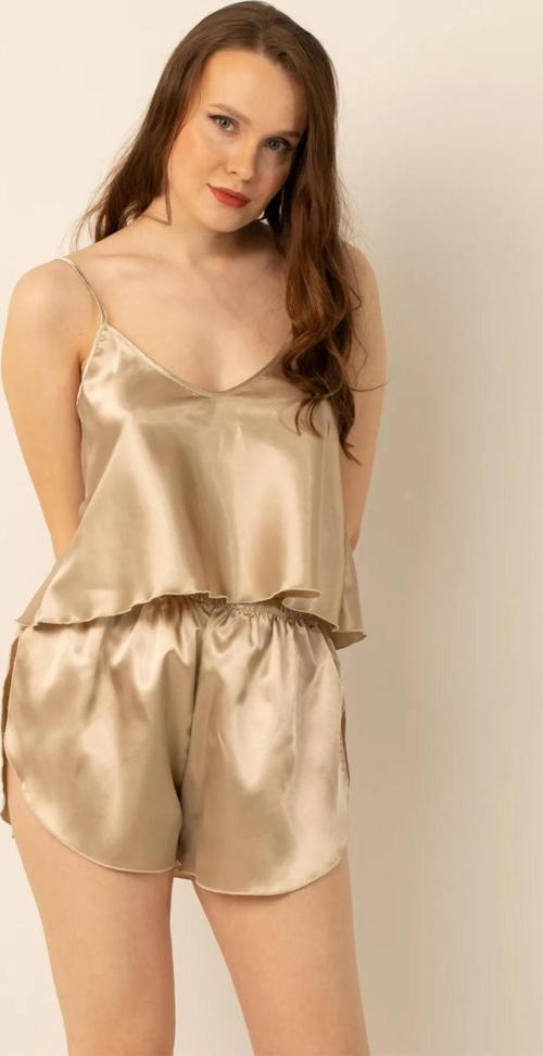 - 2 Parça Paket içeriği: 1 adet ipeksi saten ip askılı üst, 1 adet ipeksi saten derin yırtmaç detaylı şort.
