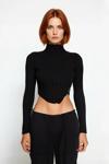 Ürün Özellikleri: Fitted kalıp, %72 Viskoz %28 Polyester materyal, düz desen, dik yaka, standart kol, triko kumaş, siyah renk, süper crop boy, asimetrik siluet.