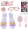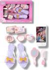 Önce havalı güneş gözlüğünü tak ve kendine güvenli bir duruş sergile! Ne kadar da şık oldun! Ardından aynayı eline alıp güzelliğine hayran kalabilirsin. Eğer saçların biraz dağılmışsa endişelenme, tarak ile onları kolayca şekillendirebilirsin. Daha da kokoş olmak mı istiyorsun? O zaman muhteşem terliklerini giy ve adımlarına zarafet kat! İşte şimdi tam bir prensesesin! Setin en eğlenceli parçalarından biri de ışıklı ve sesli telefonu. Üzerindeki tuşa bastığında kırmızı bir ışık yanıyor ve sevimli bir zil sesi duyuluyor. Acaba seni kim arıyor? Belki de en yakın arkadaşın seni oyun oynamaya davet ediyor! Saçlar tarandı, gözlük tamam, en şık terliklerin de ayağında. Son bir kez aynaya baktıysan artık tüm dikkatler senin üzerinde olacak!