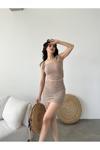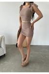 Kalın askılı yapısıyla omuzları rahat ettirirken, büzgülü detaylarıyla modern bir dokunuş katmaktadır