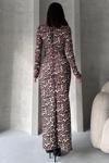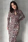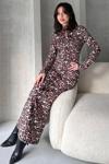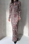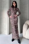 Kadın Dik Yaka Cut Out Detaylı Leopar Deseni Uzun Elbise Kahve L