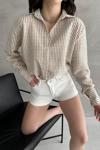 Fav Style Kadın Oversize Çizgili Uzun Kollu Dokuma Gömlek Bej L