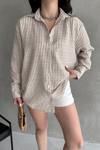 Kadın Oversize Çizgili Uzun Kollu Dokuma Gömlek Bej S