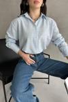 Fav Style Kadın Oversize Çizgili Uzun Kollu Dokuma Gömlek Mavi L