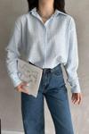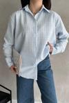 Kadın Oversize Çizgili Uzun Kollu Dokuma Gömlek Mavi L