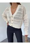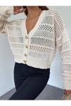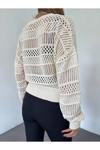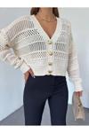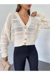 Ajurlu deseniyle modern ve şık bir görünüm sunan bu kadın hırkası, bej rengiyle kolayca kombinlenebilir.