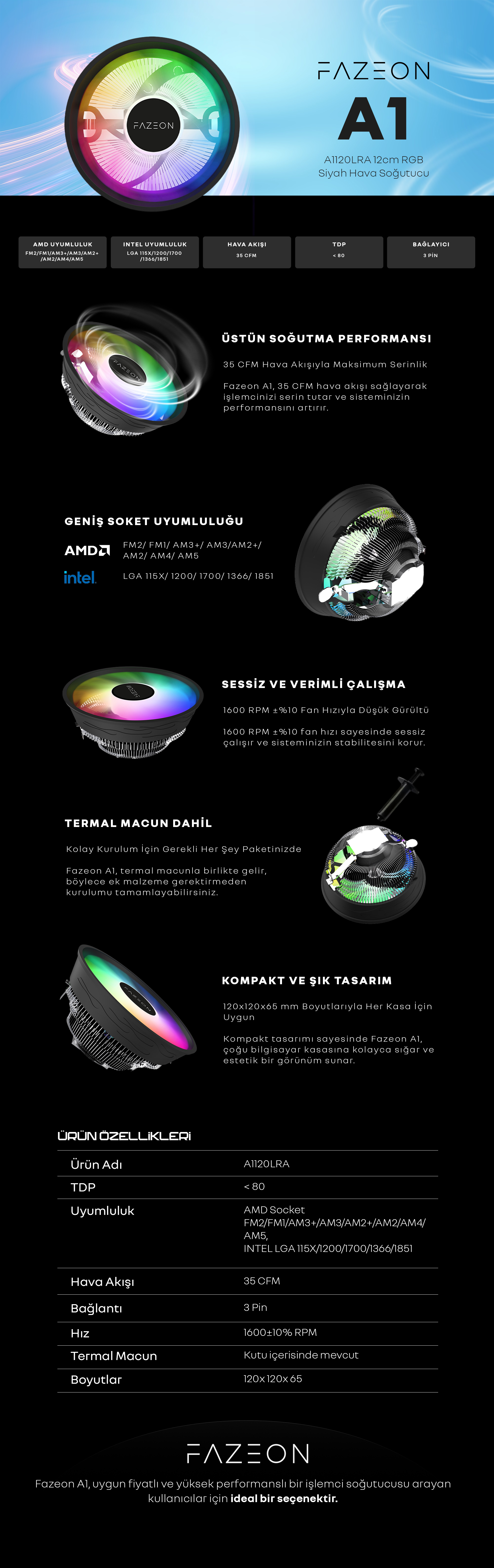 FAZEON A1120LRA 12cm RGB Siyah Hava Soğutucu