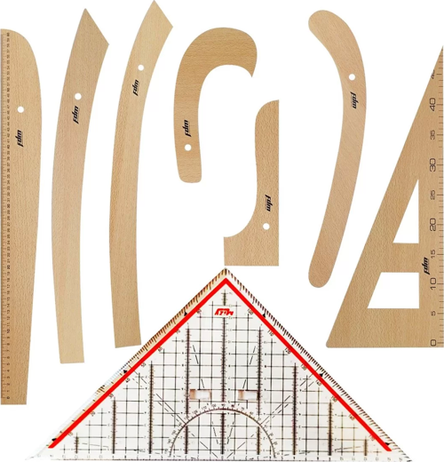 FDM 8 Parça Set - 7 Parça Ahşap Riga Seti ve Modelist Gönyesi - Riga Takımı -Dikiş Seti Cetvel